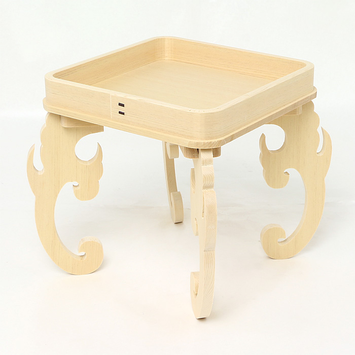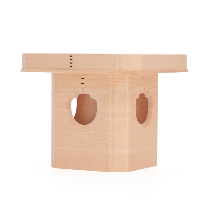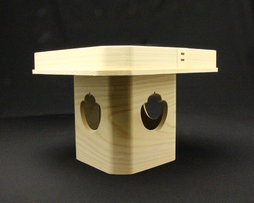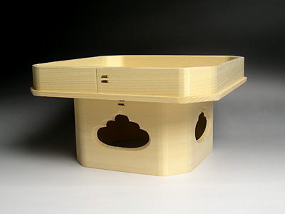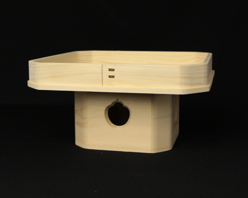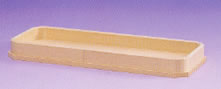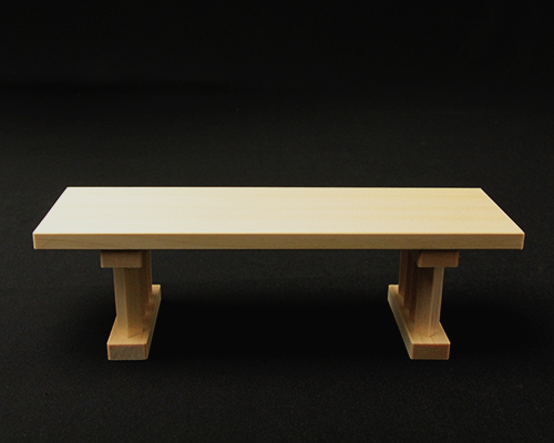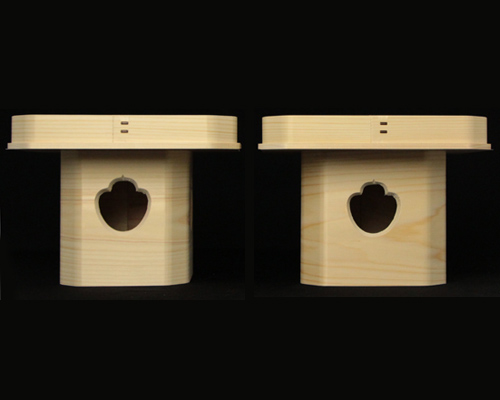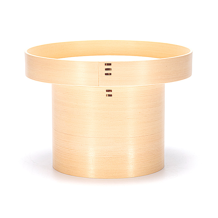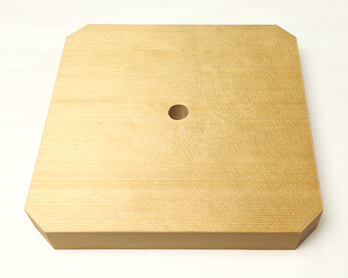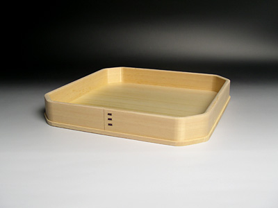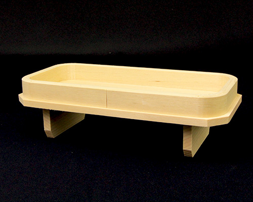 宮忠で扱っている三方の材種は、木曽桧、代用材(ホワイト・スプルス)、吉野桧の3種類あります。木曽桧製は長野県木曽の国有林(官材)から切り出された天然木で樹齢200~400年の木曽桧の赤身を使用しています。代用材製はアラスカ等で産出される外国材で、スプルスの中でも特に色の白いホワイト・スプルスを使用しています。吉野桧製は地場に人工造林された桧材で、写真でも見られるように木曽桧製、代用材製が目の細い柾目の良材を用いているのに対して板目材の赤身と白身の混じった源平材を使用しています。