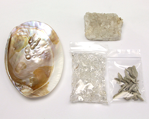 | ■重量(約・g) | 【水晶クラスター】50~100g(参考商品) 【淡水シェル】80~100g(参考商品) 【水晶チップ】150g 【セージ】2g |