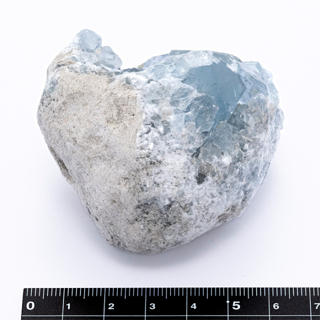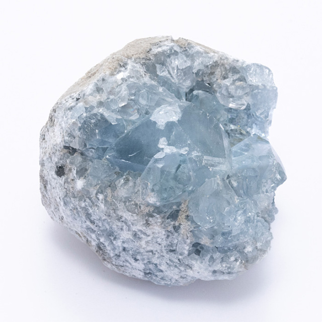 セレスタイト(Celestite)は、美しい淡い青色が特徴の鉱物で、主に硫酸ストロンチウムで構成されています。セレスタイン(Celestine)とも呼ばれます。セレスタイトの名前は、ラテン語の「caelestis(天の、空の)」に由来しており、その青空のような美しい青色を指しています。この色は、セレスタイトを特徴づける最大の魅力の一つです。