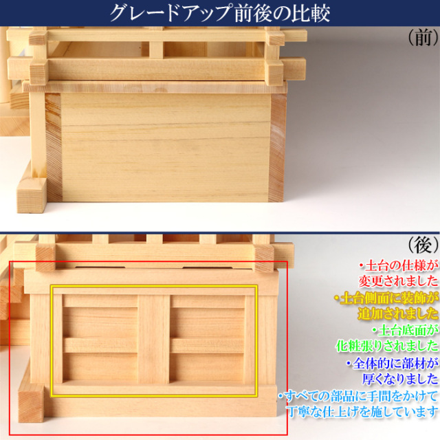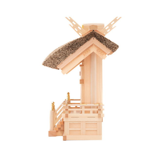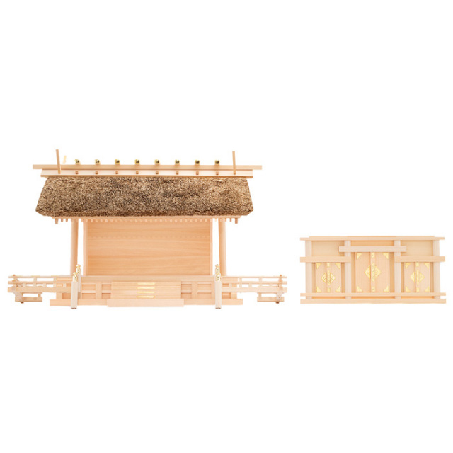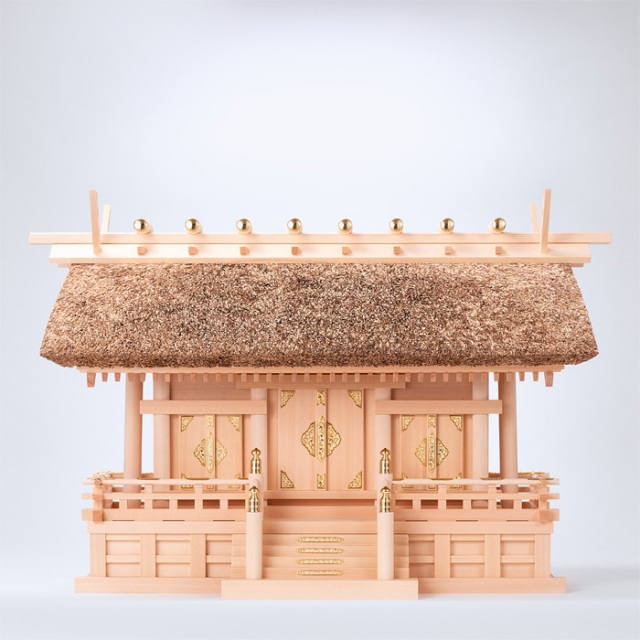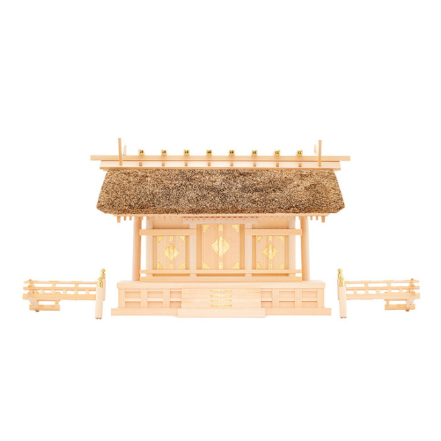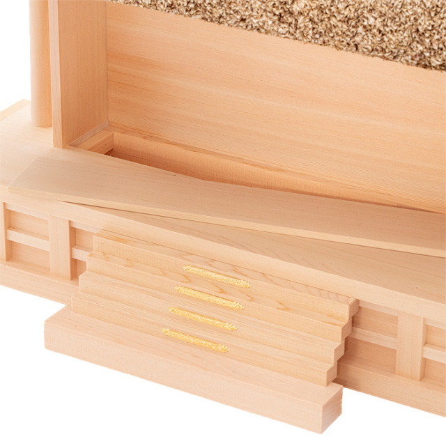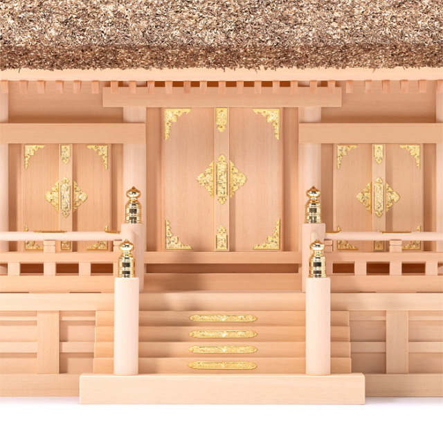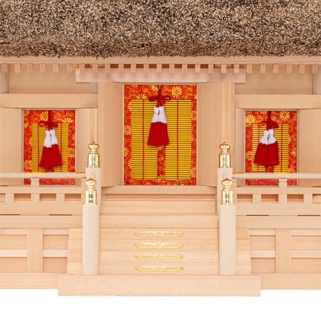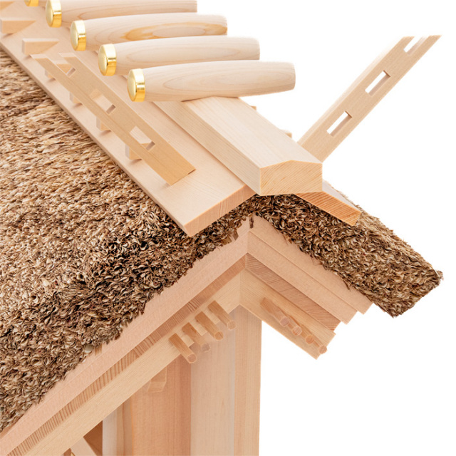 ![]() | 茅葺神棚(神殿)の三社造りです。 御扉に本金鍍金仕上げの金具を釘で取り付けます。 御扉周りには、なるべく木目の細かい材料を使用します。 屋根の垂木にも一本一本面取りが施され、色を合わせ屋根に取り付けております。 |
