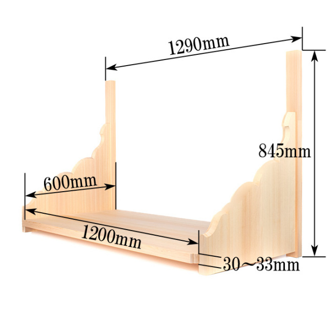 | ■サイズ(約・mm) | (神棚板)総幅1290(板長1200)×奥行(板幅)600×高さ845(参考商品) 板厚30~33(参考商品) (雲板)幅1265×奥行45×高さ120(参考商品) 板厚15(参考商品) |