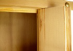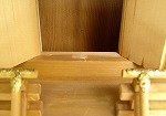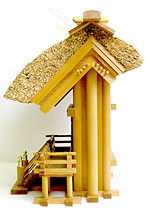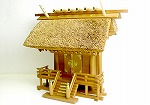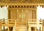 | 全体的にやけて色がよくそろっております。 また、扉は開閉するようになっております。扉を閉じたままの状態で展示しておりますので、 扉中央の重なった部分や扉の内側など、日の届かない部分は元の色でのこっております。 千木は4本とも新しいものになっております。 階段・基段・木口部位分に細かい擦り傷がございますが、遠くからではそれほど目立ちません。 |